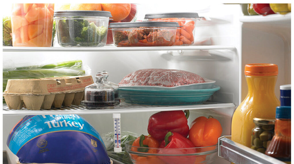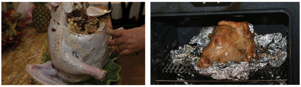 1) Cho gà Tây (trọng lượng 12-16 lbs) khi mua về, vẫn còn trong package nilon, bỏ vào khay nhôm, rồi cho vào ngăn tủ lạnh (không phải ngăn đông đá). Đây là cách tốt nhất để làm tan đá gà Tây thay vì bỏ vào nước lạnh. Cứ mỗi 24 giờ, gà Tây sẽ tan đá từ 4-5 lbs. Do đó với một con gà khoảng 12 lbs, sẽ mất trung bình khoảng 3 ngày để tan đá. Con gà 15-16 lbs, sẽ mất 3.5 đến 4 ngày để tan đá. Vì vậy, nếu chúng ta nướng gà vào ngày thứ Năm Thanksgiving, thì vào ngày tối thứ Bảy của tuần trước đó, chúng ta cho gà vào tủ lạnh để tan đá là vừa.