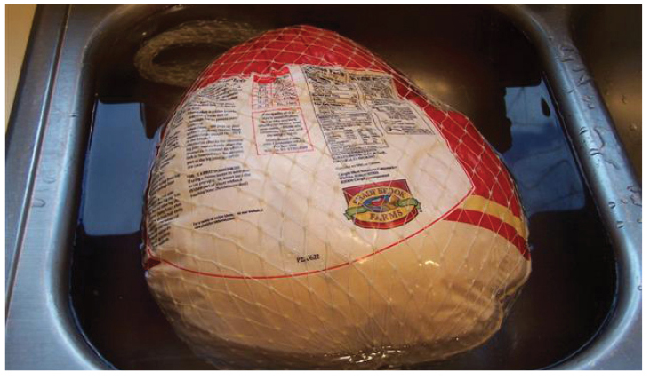 2) Để rút thời gian tan đá nhanh hơn, bạn cho Gà Tây vẫn còn nguyên trong package nilon vào một thau nhôm hay vào Sink, nhớ là để phần ức gà nằm dưới, rồi đổ ngập nước lạnh lên thân gà. Cứ mỗi 30 phút, bạn đổ nước cũ đi và thay vào nước lạnh mới. Với cách này, gà sẽ tan đá trung bình 1 lb mỗi 30 phút. Như vậy với 1 con gà nặng khoảng 12 lbs, sẽ mất bạn 6 tiếng đồng hồ để tan đá. Con gà 15-16 lbs, sẽ mất bạn 7.5 đến 8 giờ đồng hồ để tan đá.