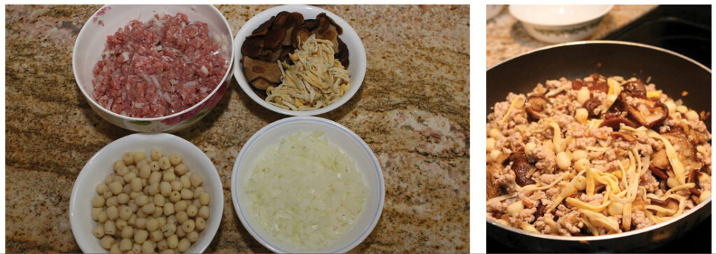 - Thịt heo xay, ướp với củ hành vừa mới cắt, 1 muỗng càfe bột nêm và một ít tiêu xay.