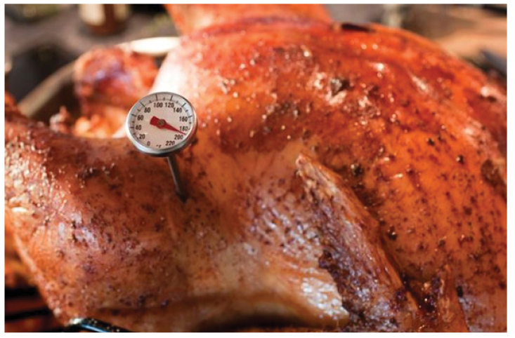 - Ở nhà có cây cây đo nhiệt độ thịt (meat thermometer), bạn xâm thử vào phần thịt ở đùi gà, nếu nhiệt độ ở đùi gà là 180 độ F và nhiệt độ ở thịt ức gà 170 độ F tức là gà đã chín. Nếu chưa, thì tiếp tục nướng thêm cho đến khi thịt gà ở nhiệt độ trên.
