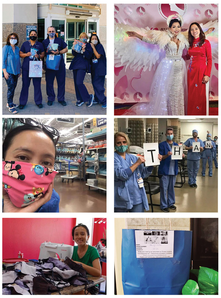Nhưng nếu chỉ dừng lại ở thành công cá nhân, câu chuyện của Catherine có lẽ chưa đủ trọn vẹn. Trong thời điểm đại dịch COVID-19 đầy khó khăn, khi nỗi lo lan rộng khắp cộng đồng, Catherine đã không chọn đứng nhìn. Cô ấy đã chủ động thành lập một nhóm tình nguyện gồm hơn 20 phụ nữ Việt tại Arizona mang tên “Help Protect Arizona From Coronavirus”. Catherine trực tiếp mời tôi tham gia để hỗ trợ vận động tài chính và truyền thông, kết nối cộng đồng Việt để cùng nhau quyên góp, mua vải và các nguyên liệu cần thiết, rồi phân phối đến các tình nguyện viên để may khẩu trang thủ công. Nhờ sự phối hợp nhịp nhàng của cộng đồng, chúng tôi đã sản xuất và trao tặng hơn 20,000 khẩu trang vải handmade cho các y bác sĩ, y tá, và nhân viên tuyến đầu tại nhiều bệnh viện, bao gồm hai bệnh viện Chandler Regional Hospital va Mercy Gilbert Hospital nơi ông xã tôi đang làm việc.
