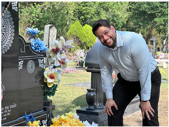 Ngày 23/10/2025, tôi đến Houston để tham dự đại hội Trưng Vương thế giới lần cuối. Ngay khi xuống máy bay, chúng tôi đến nghĩa trang Earthman Resthaven, ở Houston. Còn mấy ngày nữa là ngày của ma quỷ, người sống và người chết gần nhau. Tất cả mồ mã đều được chăm sóc một cách cẩn thận. Mộ nào cũng có quả bí đỏ và hoa.