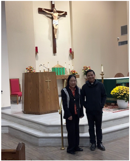 Cha Đức đưa chúng tôi đi thăm nhà thờ này, xung quanh là rừng cây xanh mướt. 2 nhà thờ cạnh nhau, nhà thờ cổ và nhà thờ mới rất sạch sẽ, trang nghiêm. Vừa bước vào thì người thư ký của nhà thờ đứng dậy chào cha Đức rất lễ độ. Trước đây, nhà thờ này không có tín đồ là người Việt Nam, nhưng khi cha về đây, bây giờ có trên 100 tín đồ Việt Nam đi nhà thờ này. Cha Đức là cha chánh xứ, cha phó xứ cũng là người Mỹ gốc Việt.